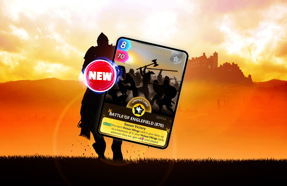 And since you’ve got your armor on, pick up the Fight You Cowards History Album pack which has a chance for the new Battle card, Battle of Englefield (870). This battle between the Vikings and the Saxons took place on 31 December 870, which is frankly not how I’d be spending my New Year’s Eve. When drawn, for each Vicious Vikings card in your deck, up to a maximum of 5, youra Vicious Vikings cards gain +4 Power until played.
