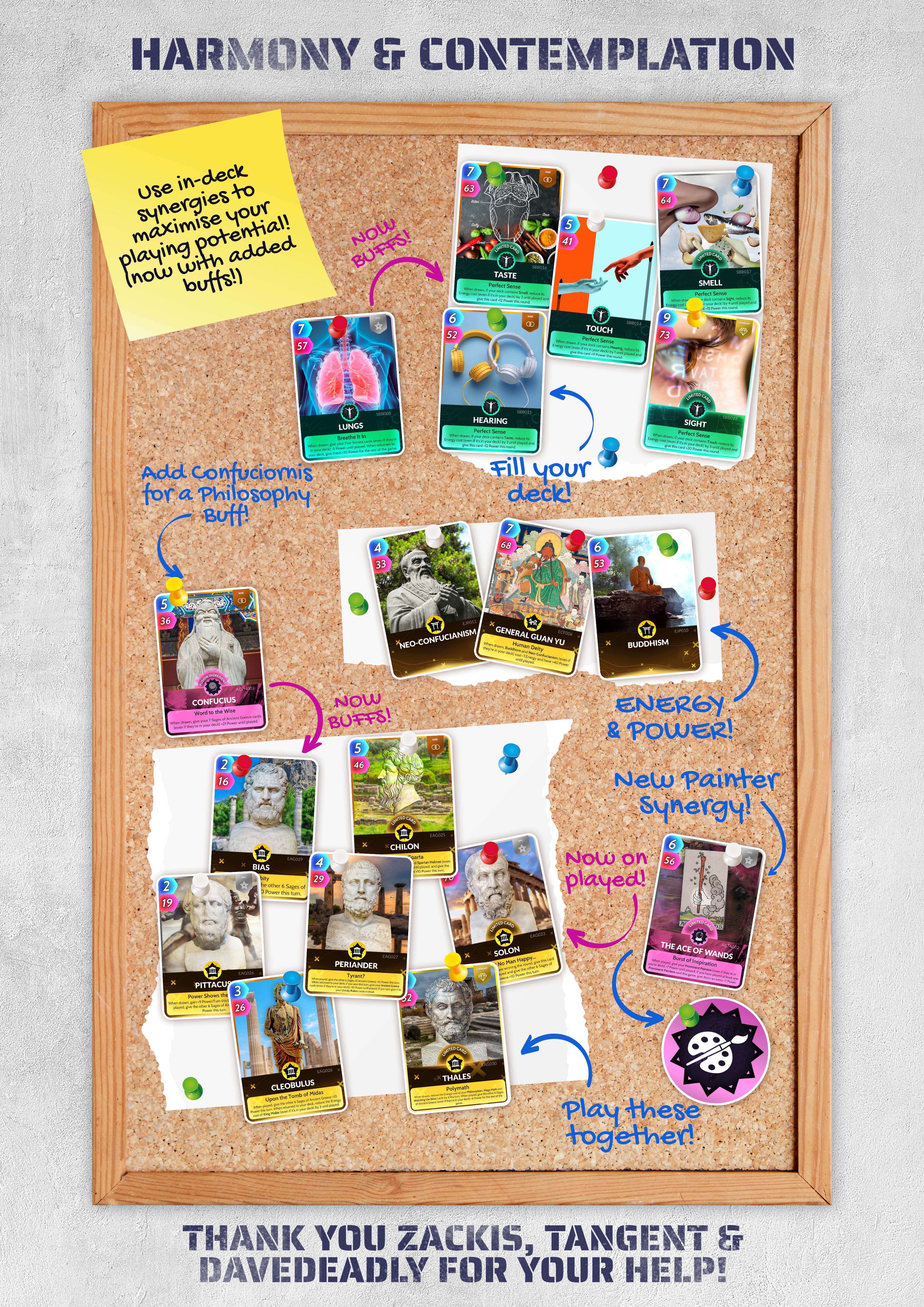 We've created some new synergies with the buffing of Lungs, Solon and Confucius - the Seven Sages are improved by Confucius's new ability, the Five Senses get extra Power from Lungs, and the new card The Ace of Wands gives your Prominent Painters an extra boost!