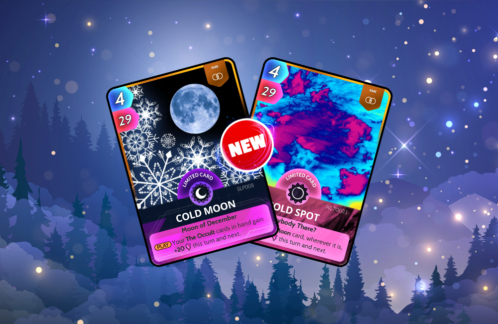 It’s another full moon out there tonight but it’s getting chilly with the Cold Moon pack. Nab this for the new Cold Moon card which will give your Occult cards in hand +20 Power this turn and next. There’s also the ghost hunter’s dream, the Cold Spot which will give your Cold Moon card +29 Power this turn and next. I think it’s time for my scarf and gloves!