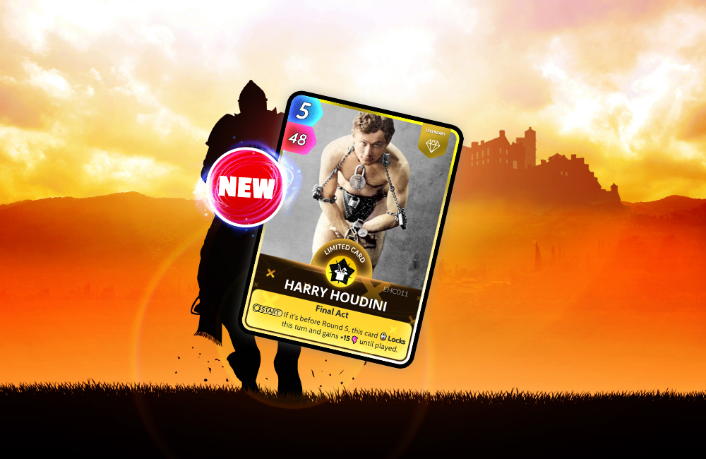 At the top of the bill in today’s show (or, you know, in the store) is probably the greatest magician, illusionist and showman in history. That’s right, it’s the one, the only, the Great Harry Houdini! He’ll be escaping from the History Album pack from 17:00 UTC so catch him while you can. Watch in amazement as the amazing escapologist adds some pizzazz to your deck. While in your hand, at the start of each turn, if it is before Round 5, this card will lock for this turn and gain +15 Power until played - leading to a massive late game play!