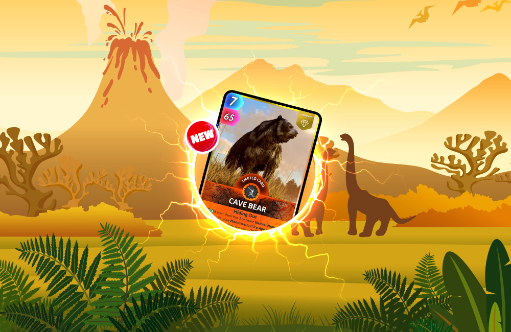 You won’t miss today’s Paleo Finder pack because it’s attempting to hide a giant Cave Bear! This 3.5m tall bear will, when drawn, if your deck contains at least 3 Natural Monuments cards, give your Mammals and Ice Age cards +25 Power until played.